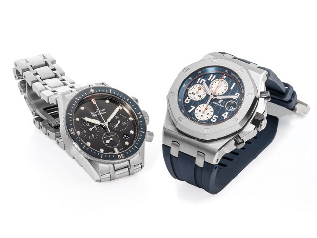 ▲左為BLANCPAIN Fifty Fathoms Bathyscaphe Flyback Chronogrape,右為AUDEMARS PIGUET Royal Oak Offshore Chronograph 42mm。