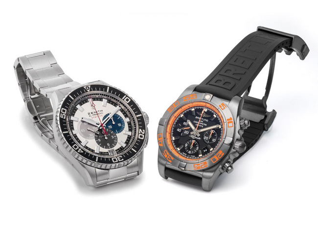 ▲ 左為ZENITH El Primero Stratos Flyback Tribute To Felix Baumgartner,右為BREITLING Chronomat 44 Raven。