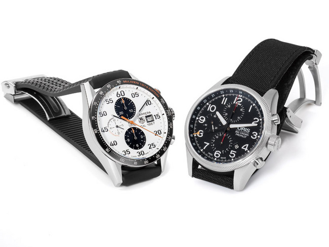 ▲ 左為TAG HEUER Carrera Calibre 1887 McLaren 40th Anniversary,右為ORIS Big Crown ProPilot Chronograph GMT。
