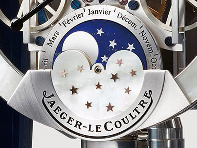 打開鐘殼,便可得見內部機械結構。鐘盤採珍珠母貝製成,其上鑲貼大溪地珍珠母貝時標, 柔和紋理呈現雅致美感。6點鐘位置則設置了搭配月份的月相顯示。星空圓盤以青金石打造,青金石之名源自波斯語中「藍天」一詞,被奉為寶石中的至寶,此番運用使之與鐘殼上的麥稈色澤相襯,更顯神祕迷幻。鐘款搭載積家582型機械機芯,能量來自溫差變化,每攝氏一度的溫差變化能為座鐘提供48小時的動力儲存,而其環形平衡擺輪消耗的能量比普通手錶少250倍,節能設計兼顧環保意識,月相顯示功能則可在3,861年內保持精準,令人驚歎。