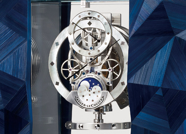 ▲ JAEGER- LECOULTRE Atmos Marqueterie Paille技術特性:積家582型機械機芯/藍色麥稈鑲嵌工藝鐘殼/規範指針式時、分顯示/萬年曆月相顯示(3861年內僅1天誤差)/限量發行8座