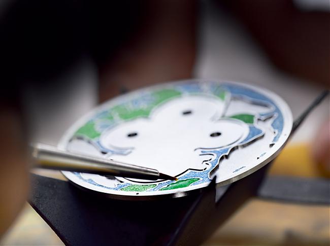 雕刻師是整道工序裡的第一位工匠。先對材料進行加工、切割和建模,為作品注入生命並雕刻出從各個方向都能反射出琺瑯光澤的紋理。正是在雕刻師的手中,線條、弧度、細節、葉脈以及鱗片逐漸清晰起來,最終雕刻而成的錦鯉和荷葉活靈活現,仿佛在水中微微顫動。接下來是琺瑯師的工作。琺瑯師負責施色,各類色調,包括透明色調的呈現都精妙絕倫,宛若活物。這種深邃、立體、和諧的色彩效果,得益於「大明火」(grand feu)琺瑯。