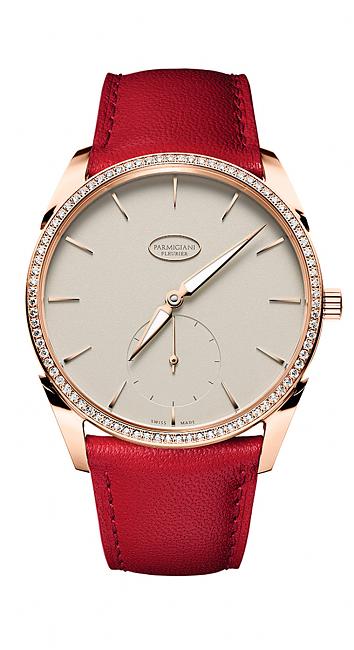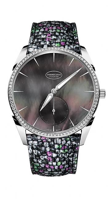 系列中有一款錶帶便是採用這種工藝精製而成,斑斕的色彩形成一種圖元化的馬賽克效果,宛如蝴蝶的美麗翅膀。黑色底面,局部疊加銀色,輔以綠色或鮮亮的紫紅色點綴期間。金屬般的彩色光澤使得Tonda 1950手錶化身為流行時尚的代表作,又不乏沉穩經典的優雅氣質。夏日系列(The Summer collection)還包括兩款色調濃郁的小牛皮錶帶:光彩熠熠的珊瑚紅和青檸綠。為此,帕瑪強尼在皮革的挑選上精益求精,皮錶帶最終帶有極為細膩的粒紋效果。錶帶如柔滑如綢,給佩戴者的手腕帶來天鵝絨般的觸感,為每一天的佩戴都帶來愉悅之感。