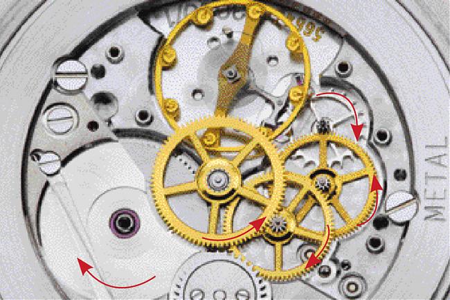 ▲ 我們以愛彼錶的Cal.3090機芯來做範例,圖中箭頭所指示的方向,即為齒輪轉動的方向。