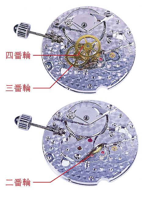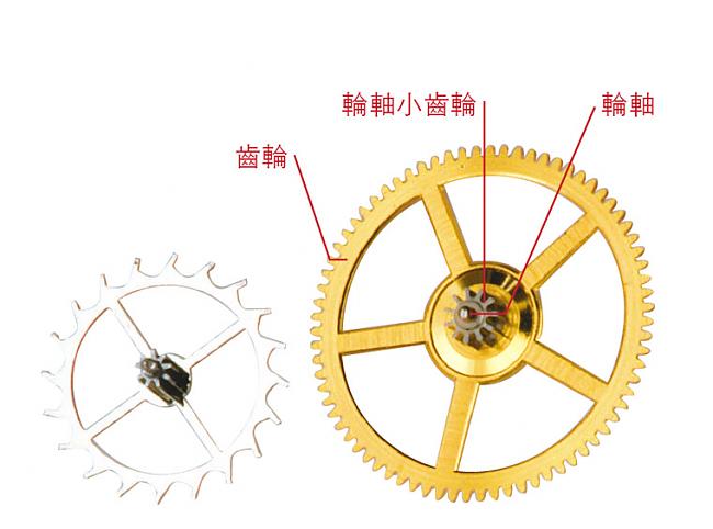 每一個齒輪主要分為三個結構,由銅合金製成的金黃色齒輪,以及貫穿齒輪中央的不鏽鋼軸心(稱為輪軸),還有固定在齒輪上方或下方的輪軸小齒輪。透過齒輪與輪軸小齒輪連動,例如:當二番輪轉動一圈時,三番輪就可以轉動6、7圈以上,傳遞到五番輪時,可以轉動700圈以上,因此小小的一個發條盒,可以提供40小時、或是7天的動能,這就是透過奇妙的輪系設計,才得以達成的功能。