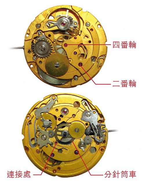 不過這幾個齒輪,只能顯示到分鐘的數據,因此在機芯的背面(本文的機芯背面係指接觸面盤那面),有連接分針筒車的日裡車(時針轉換齒輪),將轉換的動能傳遞到時針傘車(也就是時針插入的底座),因此透過這樣的轉換,就有了清楚的時、分顯示功能。