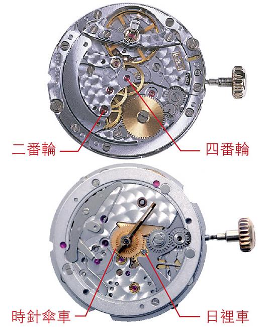 由於傳動時針輪系的零件都位於面盤下方,因此除非拆除面盤或是觀看鏤空錶款,否則不容易看見時針輪系結構。從這張圖我們可以看到中央位置的分針筒車,右側連接日裡車,當時針傘車套在分針筒車之上,齒輪邊緣與日裡車上層的小齒輪嚙合,因此時針傘車可以準確的顯示小時功能。