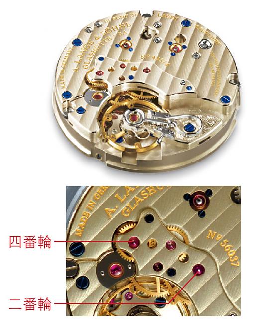 ▲ 在2006年朗格推出了第一款大三針手錶-The Richard Lange,這款手錶採用Cal.041.2手動上鍊機芯;它的機芯架構就是朗格的計時機芯,廠方設計師特別將計時結構去除,因此成為了一枚手動上鍊機芯。但是原設計就是小秒針的結構,因此Cal.041.2在四番輪上加裝兩個齒輪,連接到分針輪上的大秒針輪軸,成為一枚大三針機芯。其實這樣的設計,存在於許多早期的機芯上,因為原本的結構是小三針設計,所以需透過夾板上方的附加齒輪,連接中央的大秒針輪,形成大三針功能,著名的勞力士Cal.1570機芯,也是使用相同的設計。