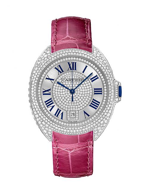 錶殼與面盤鋪鑲鑽石,搭配桃紅色鱷魚皮錶帶