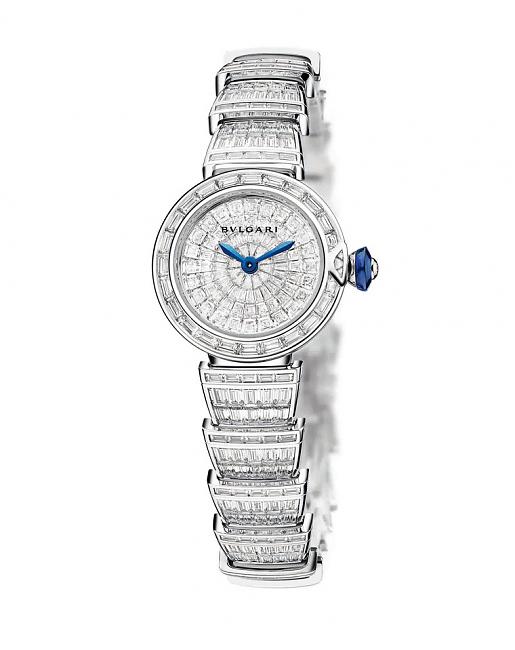 LVCEA 誕生自光線。整體採經典風格設計,透露強烈的 BVLGARI 精髓。三種新款式都引人注目,都直截了當卻又能優雅地反映光線的純淨。全新的直徑23 毫米尺寸,這款時髦的珠寶手錶透露了絕對的華麗氣息。BVLGARI選用白金,和四種最貴重的寶石:皇家之寶──鑽石;綠柱石家族中世人最渴求的──祖母綠;以及兩種最高級的剛玉,亦即藍寶石與紅寶石。一款是全鑽石款式的LVCEA,限量五件,配置藍色指針,錶冠採用凸圓形藍寶石製作,上面鑲嵌一顆圓形明亮式切割鑽石。另外,鑲有紅寶石或祖母綠的款式,分別限量三件,錶圈和錶鏈也都鑲嵌了彩色寶石。僅錶鏈部分即鑲嵌了逾14克拉的珍貴寶石,可謂錶鏈本身就是一件珠寶。由 84 顆長形切割鑽石組成的圖案,在面盤上形成美麗的律動,宛如時間的刻痕,讓人聯想起這款手錶的靈感之源──日晷。在密封鑲嵌和隱形鑲嵌長形切割寶石的烘托下,華麗的光芒融合了獨樹一幟的 BVLGARI 風格。若說LVCEA系列把女人整個裹在光線中,一點也不為過。