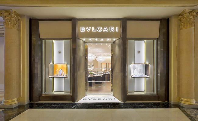 澳門銀河酒店專門店由著名建築師 Peter Marino 設計,運用羅馬建築常見的古雲石和充滿懷舊意味的石材,在創新與傳統之間交互揮灑,並以現代詮釋的古典幾何學表現之。譬如90平方米的幕牆,鋪了充滿古老氣息的黑白紋理雲石和石灰岩,鑲以金屬金葉圖案,靈感來自珠寶本身的色調和形態(Star Skin裝飾圖案)。整體視覺美感中,還包括三扇大型品牌櫥窗在一邊,另一邊則是以御用藏紅山東綢裝飾的三扇 Condotti 櫥窗。這是經典的 Condotti 大街 10 號的櫥窗樣式,令人想起 BVLGARI 的原始格局,亦即迄今仍在羅馬 Condotti 大街 10 號旗艦店歷史傳承的櫥窗。