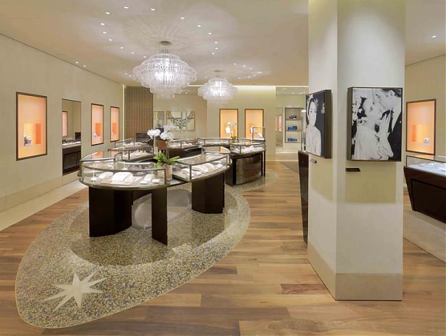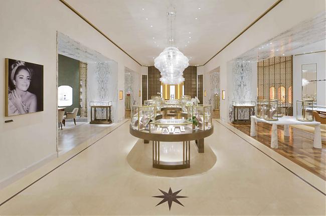 優雅的休息室是以羅馬旗艦店「伊莉莎白泰萊休息室」的魅力所複製的。休息室之名取自 「IL Salottino Taylor」,亦即想當年伊莉莎白泰萊等荷里活女星在這個私人專區待了無數的快樂時間,並利用這所義大利宮殿的「神秘門」 避開記者的追訪。這裡古董風格的扶手椅(靈感來自 Osvaldo Borsani),縞瑪瑙所造的橢圓形咖啡桌,加上厚重精美的地毯,完美襯托出 1960 年代氣氛。休息室的圓拱形天花板配以凹凸格紋,令人想起羅馬萬神殿穹頂,頂端鑲有背光式 Muran 鏡面,營造出陽光穿透羅馬建築物的光線效果。男士手錶區則是另一番風情。建築師在此烘托出陽剛氣息,找回19世紀西方國家紳士俱樂部的氛圍。此處色調則較深重,從深灰、青銅以至墨綠,牆面則飾以綠色 Scagliola 燒塗效果。
