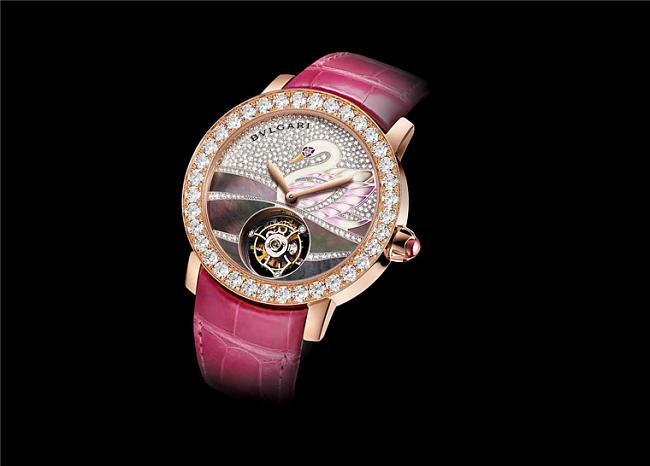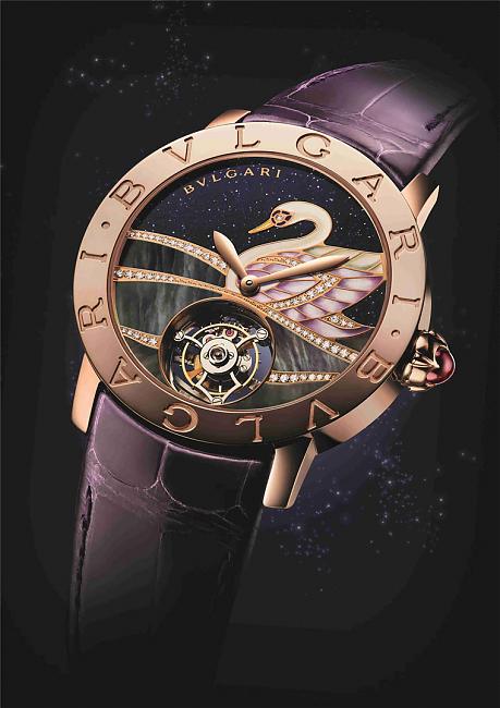 寶格麗Giardini系列手錶再度譜寫優雅詩篇,仿若走進藝術花園。在這裡,精湛一流的工藝融合了大膽創新、匠心獨運的設計,錯綜複雜的精妙構造與人內心深處對美的渴望相映成趣。此系列中的IL GIARDINO LARIANO手錶令人想起科莫湖區的醉人魅力。手錶也向人們娓娓道來砂金石被幸運發現的故事:在文藝復興時期,穆拉諾島上一個生產玻璃的家族將銅屑掉入了玻璃液中,金屬亮片便呈現出閃耀的鍍金效果。玻璃製成的深藍色夜空下,鑽石營造出閃爍群星,在色彩細微漸變的袖珍畫襯托下,優雅的白天鵝愈發高貴。精細的筆觸描繪出粉紫色濃淡漸變。填充天鵝圖案的5種顏色需經過5重上色及多次燒製。藍灰色大溪地珍珠母貝水面,透明錶橋上鑲嵌陀飛輪,劃過水面的天鵝在陀飛輪上方鑽石浪花的映襯下格外美麗。