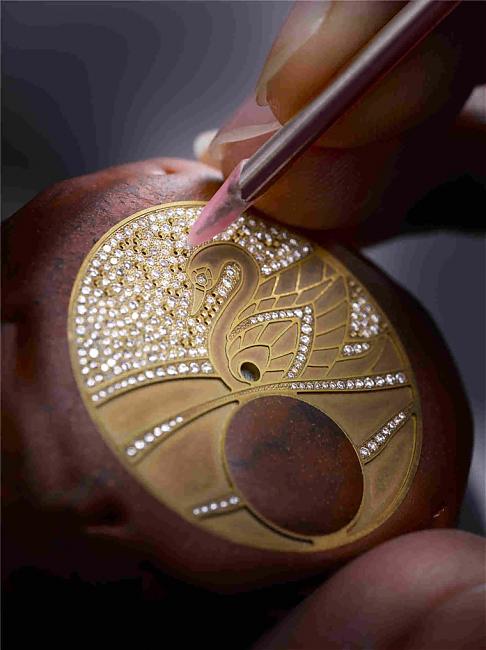 IL GIARDINO LARIANO意在表現紅日倒影水中,波光粼粼的場景。這些都要歸功於應用在這些面盤上的多種精湛嫻熟的鑲嵌工藝。置於天鵝之後的雪花背景是由三種不同規格的309顆鑽石鑲嵌而成。寶石鑲嵌工匠會用上整天的時間找到完美的鑲嵌式樣,並在固定的位置上鑲嵌好每一顆鑽石。