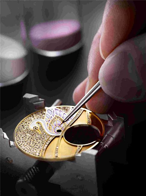 IL GIARDINO LARIANO手錶還採用了精細考究的微繪工藝。微繪這項藝術無比高貴且過程複雜。這項工藝既需要保證精確,又需要有耐心,才能調出明亮、濃重或清薄的色彩。微繪工藝可以充分挖掘出每一個微妙的色彩,從而使調色板上的色彩豐富程度可以同大自然本身的色彩相媲美。微繪工藝最先採用淡色,由淺入深,最後用深色,以形成鮮明對比、陰影和立體效果等。這種工藝擁有很高的自由度,使微繪藝術家有餘地描繪出精準的細節,而用其他方法很難實現這一點。每上完一層色,面盤要放置於90攝氏度的窯中鍛燒,從而使材料變干和凝固。IL GIARDINO LARIANO手錶用5種色彩繪出栩栩如生的天鵝圖案,成就這一驚艷的藝術傑作。