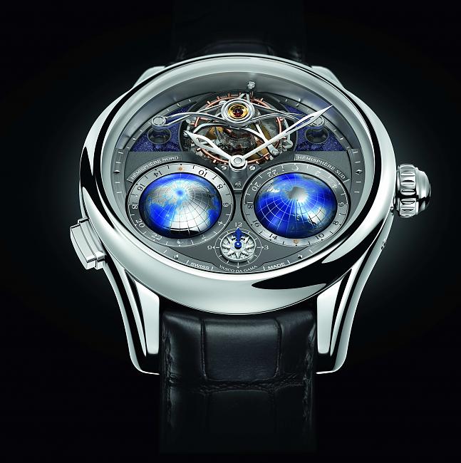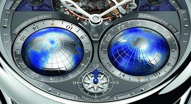 兩個微型地球儀演示了北半球與南半球的晝夜更迭,兩個地球儀上的雕飾與微型圖畫呈現了各大洲的清晰輪廓、邊界與分隔各州之海洋,上面還精心繪製了經線和緯線。兩個地球儀靜止固定於機芯,而兩個環繞著地球儀並配有晝夜顯示的24小時制世界時間指示盤則每天自轉一圈,北半球儀的指示盤順時針轉動;南半球儀的指示盤則逆時針旋轉。這使得手錶佩戴者可在一天中的任意時刻,皆能查看當前南北半球中各自為陽光照亮或背離太陽的區域。在經線經度幫助下,使用者還可依照兩個指示盤上的24小時制世界時間判斷全球各地的當前時間。