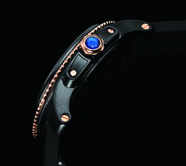 系列手錶推出多種材質搭配,其中玫瑰金鑲邊錶款,於旋轉外圈與ADLC碳鍍層光芒交織,並畫龍點睛勾勒出小秒盤及時分指針輪廓,倍添華美。