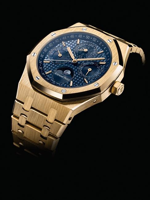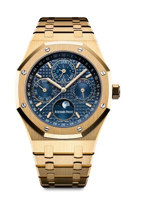 繼玫瑰金款後,愛彼在Pre-S.I.H.H.又發表了皇家橡樹萬年曆的黃金改款,黃金向來象徵財富和權利,在東方市場尤其受到消費者喜愛,應用在皇家橡樹系列上別有一種傳統雋永的興味。