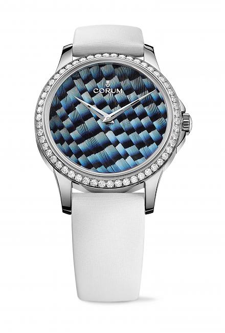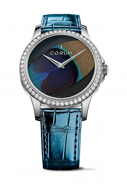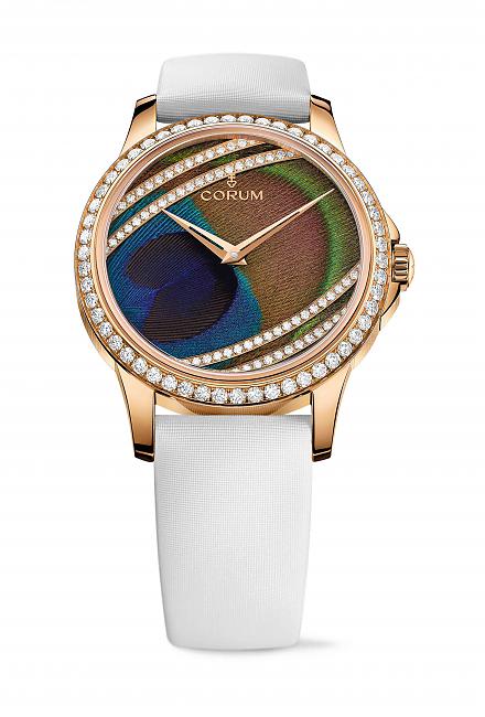 鏤空鍍玫瑰金或鍍銠太子妃形指針在面盤上舞動,緩緩滑過印在水晶玻璃錶鏡內側的CORUM標誌;坑紋錶冠鐫刻CORUM鎖匙形標誌,含蓄象徵品牌的時計美學。面盤羽毛裝飾美如畫,一錶在手,製錶工藝與古老羽毛工藝同時擁有!