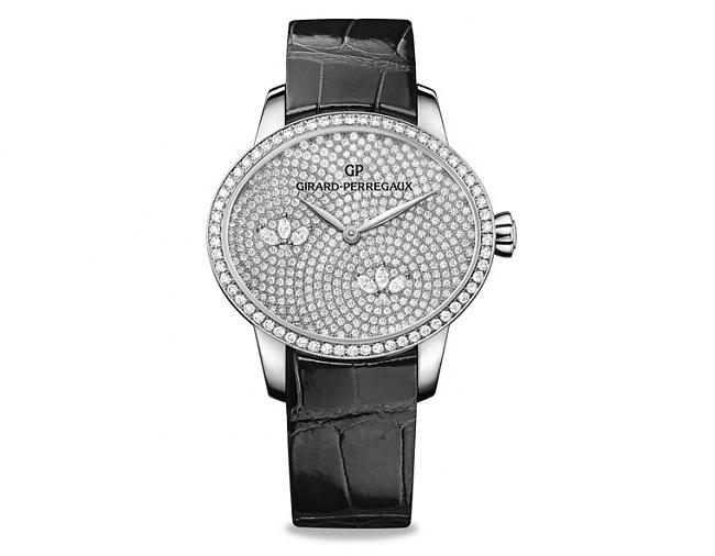 白金錶殼的錶圈爪鑲68顆閃爍圓鑽(共約0.8克拉),藍寶石水晶玻璃鏡面清澈如水。由透明底蓋可透視GP芝柏表自製GP03300-0101自動上鍊機芯、自動盤的GP標誌紋理雕刻、以及夾板與底板的精美打磨;機芯擁有小時及分鐘顯示,動力儲備約46小時。