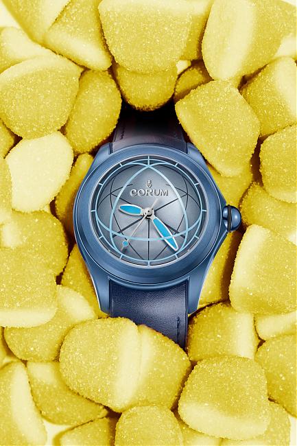 Bubble手錶的拱形水晶玻璃錶鏡厚達8毫米,可算是市面上最大的錶鏡設計之一,既有透鏡功能,也可以放大或扭曲面盤視覺效果。CORUM與工業設計師Nicolas Le Moigne攜手合作構思兩款新錶款,個中的圖案設計從視幻藝術(Optical Art)取材,設計者是出生於匈牙利的法國畫家Victor Vasarely,他被譽為視幻藝術之父。