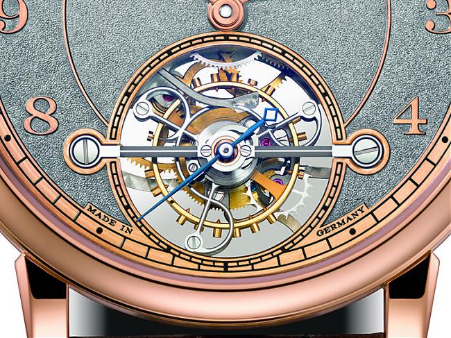此款手錶與2014年型號的最大區別在於面盤。新面盤以黑色鍍銠18K玫瑰金製成,飾有精緻"Tremblage"雕刻。雕刻師以特製刻刀,在物料上塑造出精細均勻的粒紋結構。面盤的浮雕元素,包括亮眼的弧形品牌標誌和數字,均經鏡面拋光處理,與深黑背景形成強烈對比。面盤視窗展示出大型一分鐘陀飛輪的運作。陀飛輪橋板和框架上方則經黑色表面拋光處理,是一項非常繁複且耗時的修飾技術。