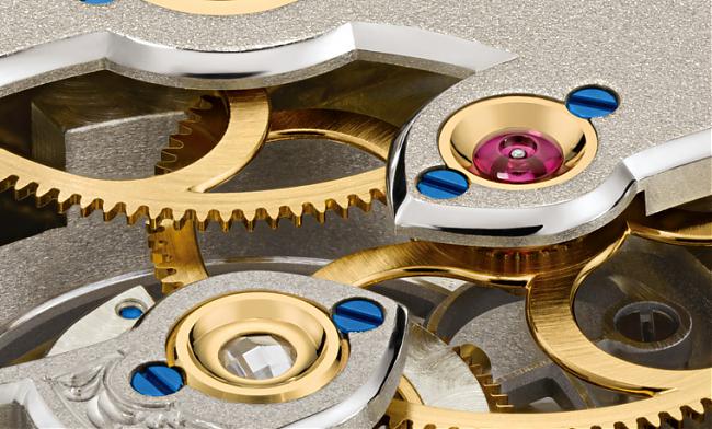 在裝飾瑰麗的L102.1型自製機芯中,每個細節均體現出精準機械特性。全新設計的3/4夾板融入優雅曲線,獨具一格。藉著大型鏤空設計,佩戴者可在機芯一面輕易觀賞到結合專利停秒裝置的陀飛輪,以及發條盒和輪系零件。德國銀夾板的粒紋表面取材自歷史懷錶的造型。於凹入角進行倒角拋光更是一大挑戰,必須由手工以專門設計的鋒利工具方能完成。四番輪橋板亦設鏤空設計,方便觀賞陀飛輪。與夾板和底蓋一樣,此橋板亦綴以精巧雕刻。陀飛輪鑽石端石使機芯裝飾更加突出。