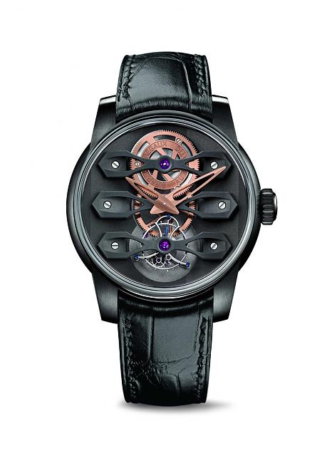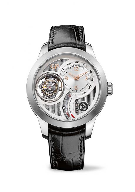 此外,為了盡可能提升立體效果,GP芝柏表研發團隊重新設計面盤,與橋板同樣以黑色噴砂處理的面盤,可加深透視效果。精緻的面盤同時也被設計成錶框,被凸起的水晶保護,從而構成一個能完整觀賞陀飛輪的大視窗。陀飛輪亦是以鈦金屬打造,和傳統的不鏽鋼版本一樣,經過頂級製錶加工,配有紋飾錶面和手工倒角。一分鐘陀飛輪直徑為14.44毫米,配備80個零件總重量僅0.25公克,擺輪遊絲由金質螺絲調節,每秒單向震頻3赫茲,並具備長達60小時的動力儲存,透明底蓋可讓錶迷仔細欣賞機芯內部零件與運作美態。