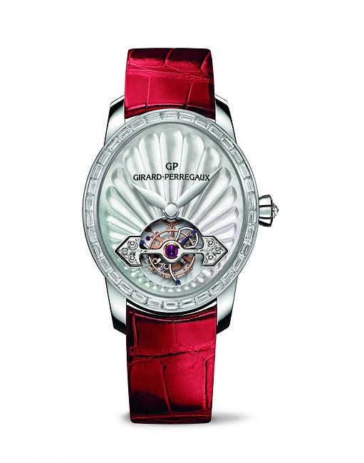 白金材質/GP09700-0012手動上鍊機芯/時、分、小秒顯示/陀飛輪裝置/白色珍珠母貝鏤雕面盤/錶圈鑲鑽/藍寶石水晶鏡面/錶徑37.3x32.3mm/參考價:NT$ 5,888,800