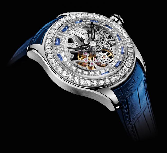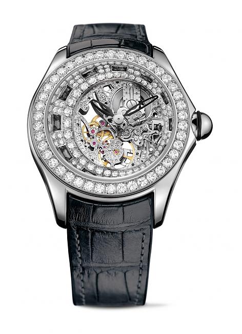 炫目的鑲鑽面盤下方配置了CO 055機芯。渾厚的拱形藍寶石水晶鏡面宛如一面放大鏡,令機芯的精美細緻裝飾一覽無遺。略呈偏心式配置的機芯承襲了Bubble泡泡手錶一貫的奇巧意趣,其橋板與機板均以手工雕刻鏤空,僅保留不可或缺的部分。
