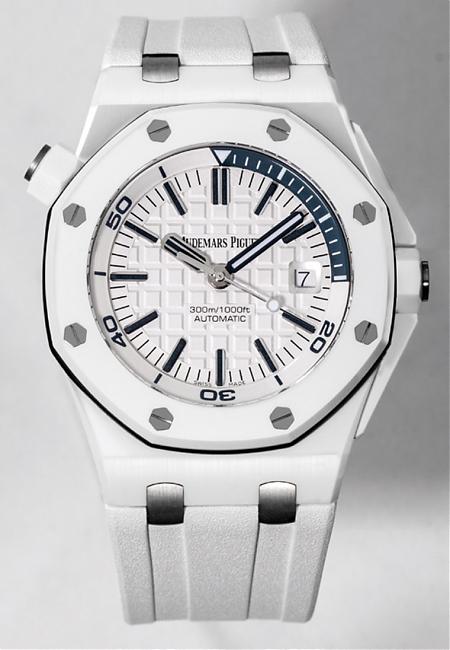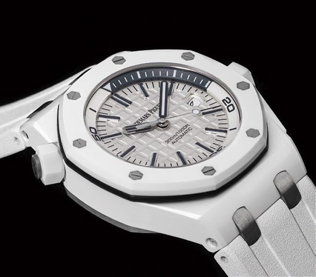 皇家橡樹離岸型的潛水錶原本是AUDEMARS PIGUET 愛彼專賣店的限定款式,2010 年轉為一般販售之後旋即大受歡迎;它比一般的皇家橡樹顯得年輕,又不像離岸型的計碼錶來得那麼繁複,可以說是剛好填補了品牌在產品區隔上的一個段差,除了賣相好之外還很有戰略意義。自從2010 年以來ROO 潛水錶幾乎每年都有不同材質、配色的改款,從最早的鋼殼黑面、鍛造碳黃圈、黑陶瓷橘圈、這款的白陶瓷藍圈到2015 年的鋼殼白面,每款都打中了至少一種現在流行的趨勢,完全就是明星商品的發展模式。白陶瓷款是相當有趣的一版,嚴格來說這種配色以潛水錶而言實用意味已經很淡薄了,但事實上白色陶瓷的規格又比黑色陶瓷來得更高,它的硬度強上40%(維氏硬度1,300:1,850),理論上會比黑陶瓷更耐用,製作起來也更費時費事,但結果它做出來的成品卻是十足的視覺導向,說來其實還滿任性的,但這也算是頂級品牌的一種特權吧。