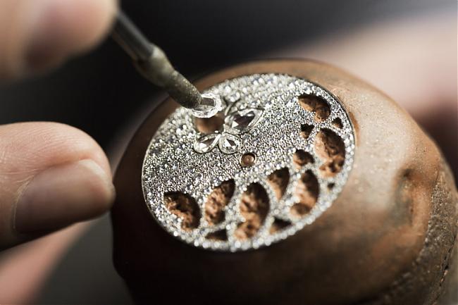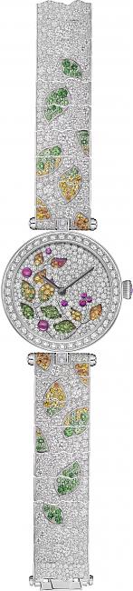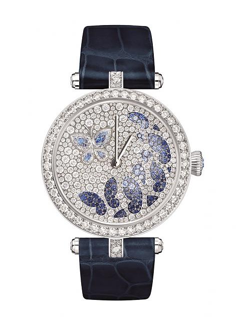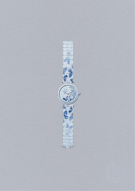 世家依仗高級珠寶工藝,細說每枚手錶背後的故事。光芒四射的頂層面盤為面盤加冕,採用雪花式鑲嵌技術綴上大小各異的鑽石 (成色及淨度均分別達D級及VVS級),與錶面配合得天衣無縫。Lady Nuit des Papillons 手錶上以四顆玫瑰式切割鑽石拼湊出彩蝶的翅膀,通透錶面隱隱透出藍調。整個轉盤鑲嵌寶石,於頂層面盤的鏤空圖案之間浮現。藍寶石及鑽石均經過精心挑選,營造出微妙漸變的層次,宛若夜幕降臨。Lady Jour des Fleurs 手錶飾以璀璨奪目的綠、黃、橙、紫四色葉子。錳鋁榴石、沙弗萊石、黃色及粉紅色剛玉和尖晶石交織出季節變幻的色彩。頂層面盤上的野莓以粉紅色剛玉鑲嵌,粉飾詩意洋溢的畫面,錶底則刻上精緻植物圖案。