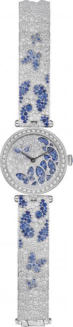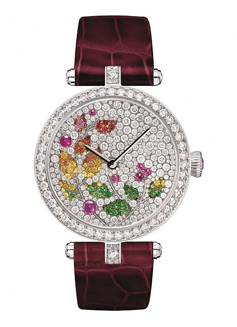 世家將高級珠寶工藝糅合 Poetic Complications 詩意複雜功能手錶系列的精神,淬練成兩款珍品,風格別樹一幟。手錶呈獻兩項新猷,包括以12小時轉盤機芯驅動的時分顯示,以及33毫米直徑錶殼 (以往版本為38毫米)。新設計造型柔美婉約,錶圈及邊緣位置鑲嵌鑽石,搭載採用12小時模組的手動機械機芯,特別為梵克雅寶獨家研發。小巧錶殼加上纖薄機芯,盡展工藝之高超精湛。頂層鏤空面盤下的轉盤,每天完整旋轉兩次,畫面循環往復。旋轉時分針背後的魔幻世界令人油然神往。