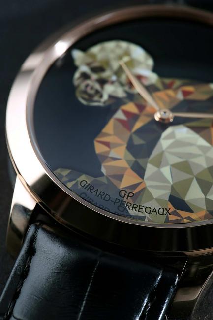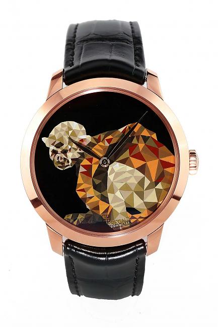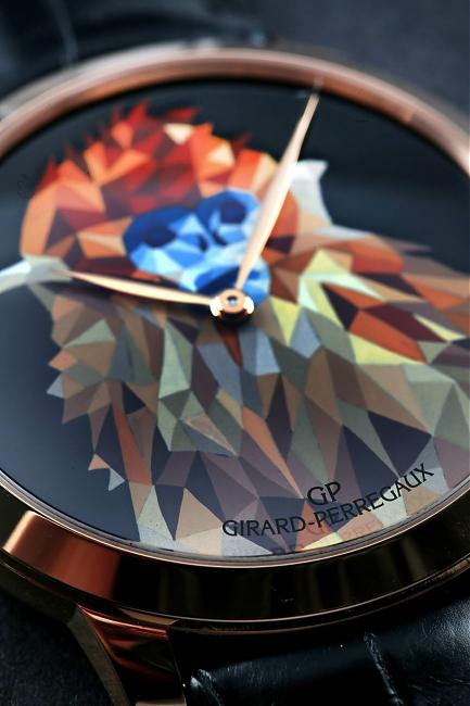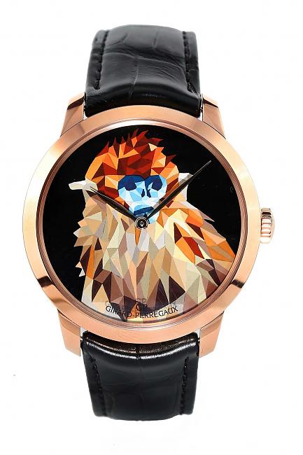 玫瑰金材質/GP03300-0060自動上鍊機芯/時、分顯示/猴子圖騰琺瑯面盤/藍寶石水晶鏡面、透明底蓋/防水30米/錶徑40mm/共三款不同面盤圖案,每款限量8只/參考價:NT$ 1,136,800