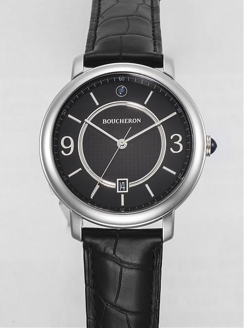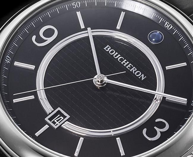 BOUCHERON以珠寶品牌跨足高級鐘錶,比較令人的印象深刻的產品果然還是以珠寶女錶為主,儘管核心的機芯技術往往還是得假手其他專業品牌,但他們家頂尖的珠寶設計、製作know-how卻也是鐘錶品牌所難以企及的,雙方合作出來的作品兼具了兩個領域的一流表現,單憑一邊很難達到這樣的成就。另一方面他們的男錶雖然不及珠寶錶突出卻也做得中規中舉,像這款Epure的三針日期款就是一例。同樣是大三針款款式,同一系列另有搭載GP機芯的版本,相對地這款裝的則是Sellita的SW300,相當於ETA 2892;機芯不同也關係到兩者的屬性定位,連帶地設計也有所差異,這款多了日期顯示,另外3、9兩個數字時標和外圈的刻度也是GP版所無,明顯地是在強化機能、實用取向,不過除此之外系列的基本元素則一脈相承,像是12點鐘的Cabochon藍寶石和錶冠上的蛋面切割藍色剛玉就是兩者都有,以統一的元素架構起系列的整體性。