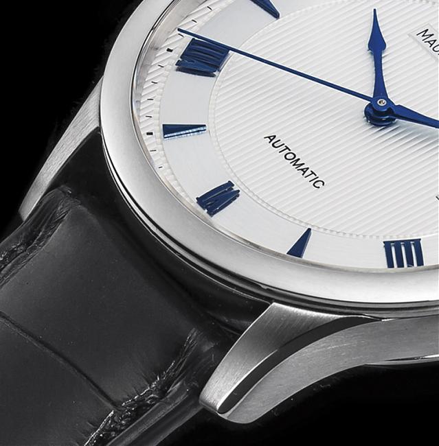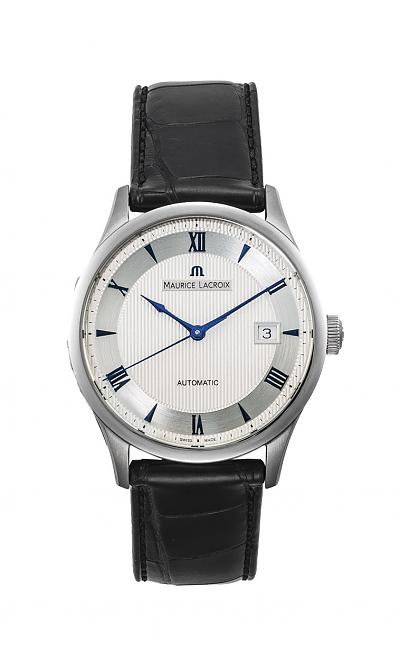 MAURICE LACROIX艾美受人注目的產品多半是設計較為特出的款式或是運動款,但其實他們家在古典一門的表現也有其獨到之處。大致上艾美慣用的設計語彙多是偏現代感的,但當他們將這些元素轉用到古典款式上的時候,如何讓這些語彙能夠自然地融入錶款整體的語法固然足以展現出設計師的功力,而融合了這兩種風格後那種微妙的異化感也成了艾美的古典錶款跟其他同類產品間最大的區隔。這款匠心系列的大三針日期款中有許多古典和現代的元素混合出現,比如說桃形針、羅馬字時標該是屬於古典的元素,然而它指針針尾水滴狀的收頭就帶點現代主義的味道,而面盤整面的刻紋要算是傳統的裝飾,但全用直線條紋的紋樣又有種冷靜的都會感,像這種古今交錯的安排讓錶款呈現出一種特異的印象,更高明的是在這當中,設計元素和運用方式,孰為古典孰為現代交互變化,像這樣的設計手法在今天的主流品牌中並不常見,凡此更能突顯品牌獨自的風格。