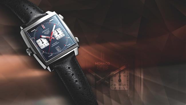 TAG Heuer Monaco(摩納哥)Calibre 11計時碼錶2015版以1969版原型腕為基礎製作而成。手錶承襲TAG Heuer Monaco(摩納哥系列)的所有標誌特徵:39毫米直徑,錶冠設於左側,傳奇的石油藍色錶盤,兩個白色計時盤,日曆視窗設於6點鐘位置,鑽石拋光水平時標,鐫刻復古「Heuer」標誌,calibre 11自動計時裝置,日曆顯示視窗,100米防水深度。