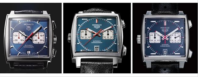 ▲ 由左至右依序為2003年、2009年、2015年(12月)推出的Monaco藍面計時碼錶,可以看出此次新作的面盤顏色更符合原型錶款的「石油藍」。