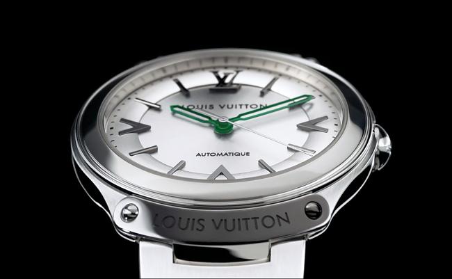 錶盤設計除了洋溢時代感外,低調的表面處理更充分發揮製錶專業。中心部位採用緞面磨砂處理,搭配邊緣的緞面陽光射線紋。兩件式錶盤異常精緻,例如周圍的小時讀數部位就採凸面配置。3、6、9點位置的小時讀數採V字型,12點位置則有LV字樣。這些設計都反映了路易威登的傳統,特別是行李箱上的知名三V標誌。此外,路易威登也大膽採用金屬色澤翡翠綠指針,原創又獨特。