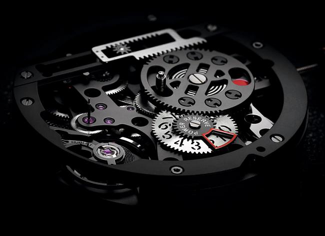 HUBLOT自製HUB 1201機芯擁有極具辨識度的特殊結構,搭載兩枚並聯發條盒和以獨特的齒軌系統連結動力儲存顯示。機芯的12點鐘位置,有兩條齒軌滑動於9點鐘到3點鐘的橫軸上。10日動力儲存具備雙顯示功能。其一於3點鐘位置在機芯動力的最後兩天會逐漸顯露紅點,而6點鐘位置標示0~10,顯示動力儲存的剩餘天數。面盤採鏤空設計,可以透視7點鐘位置的擺輪系統。10年來宇舶表對All Black設計理念的不懈堅持在此款機芯中也得到完美體現。除黑色PVD塗層外,橋板的幾何結構和硬度也與全黑概念交相輝映。得益於獨創安裝和和諧運轉,這些精密的橫向錶橋幾乎隱形「不可見」。機芯擁有強大的動力儲存,使得隨時添加其他模組、拓展機芯的易行操作成為可能。