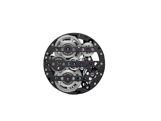 宇舶表自製機芯家族再添一員生力軍。百分之百由品牌自行設計及研發的HUB 1201機芯,手上鍊、鏤空設計,具有十日動力儲存,由223枚精密零件所組成,其中包括各種造型複雜細緻的金屬連桿、冠狀輪、齒條、機板與橋板、樞軸與棘輪等等,精妙的機械結構令人嘖嘖驚奇,絕對讓錶迷想要徹徹底底探索研究一番。