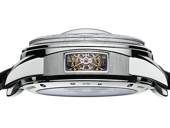 承繼著Ref. 57260的雙飛返指示與渾天儀式陀飛輪裝置,全新的Maître Cabinotier飛返渾天儀式陀飛輪搭載新的Cal. 1990手上鍊機芯,飛返式的小時與分鐘指示,落在面盤的右手邊,至於則配有球形擺輪游絲的渾天儀式陀飛輪則恢宏置於左側,並搭配藍寶石水晶玻璃拱窗與錶殼側邊的方型視窗,以不同角度欣賞渾天儀式陀飛輪的運作之美。