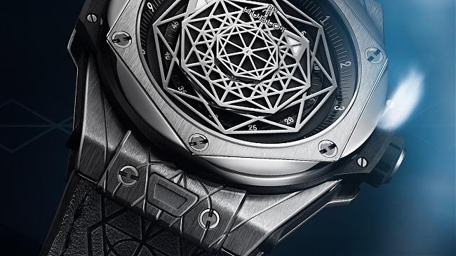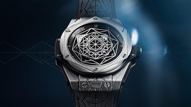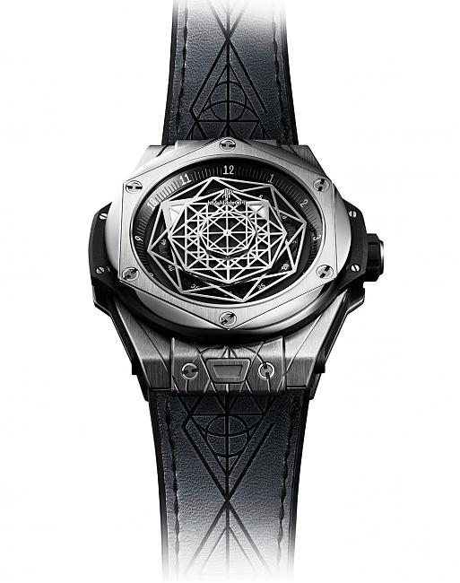 宇舶錶將此一圖形轉化至手錶上,移除計時功能的機芯通過三個八角形盤的運轉顯示時間,形成強烈視覺效果,同時,Big Bang的典型圓形錶圈經過重新設計、另外延伸出六角形;至於面盤外側的刻度環則經過緞面拉絲處理,同時阿拉伯數字也經過Maxime Büchi重新設計。錶殼、包括錶帶上同樣有線條刻紋裝飾,機芯自動盤則是三角形Sang Bleu標誌,共限量200枚。