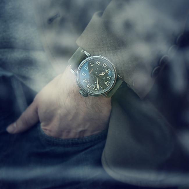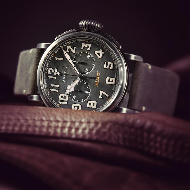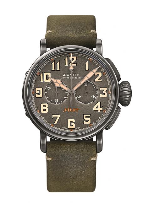 真力時'16年所提倡的復古是從精神層面以及生活方式的徹底復古,Heritage Pilot結合Café Racer主題,不僅在外型設計方面下手,並結合更深層的文化內涵。設計靈感來自二○年代英國吹起的"Café Racer"騎士風潮,原本就充滿復古味的Pilot錶殼與洋蔥錶冠,搭配帶有粒紋裝飾的青灰色計時盤,指針與數字時標均覆以米色夜光塗層。