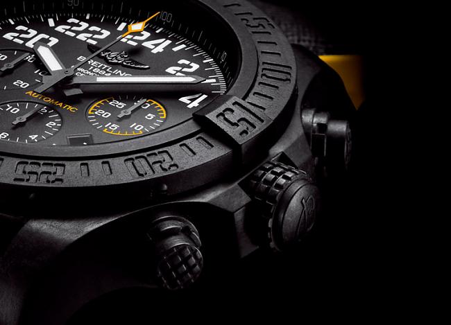 百年靈這只Avenger Hurricane雖然一片黑壓壓,但還是難掩它50mm碩大錶徑的事實,乍看之下可能以為它是黑鋼材質而暗暗覺得不妙,不由自主產生「這戴起來會不會沉甸甸呢?」的疑問。其實完全不會。因為百年靈這次使用了一項祕密武器——他們家全新開發的錶殼材質Breitlight®,別看它黑黑的不起眼,所有優良材質該有的特性它都有,舉凡防止摩擦、拉展變形、抗腐蝕、抗磁性、抗過敏、親膚性等,而且它也不像一般金屬那麼冷冰冰,天冷剛戴上時眉頭不會一皺,加上仔細看它的外觀,其實是很有特色的,在全黑色調之下,Breitlight®材質有一種彷彿經歷歲月風霜的斑駁感,摸起來或是近看都別具一種特殊效果,搭配錶款的大錶徑顯得剛剛好,至於這種高科技材質的最大特色就在一個字「輕」,有多輕呢,直接靠數據來感受相信會更有震撼力,Breitlight®材質足足比不鏽鋼輕5.8倍,就連一向號稱輕量的鈦金屬在它面前也不得不自嘆弗如,Breitlight®材質也比鈦輕上3.3倍,所以回到最初提到的,Avenger Hurricane看起來很大隻,但戴起來絕對會讓你驚訝於錶款實際重量產生的高反差。另外還有個特點就在於錶款錶帶外部是黑色Military軍用纖維材質,內裏卻使用有點騷包的鮮黃色橡膠錶帶,異材質異色搭配讓這只錶不會一路黑到底那麼沉悶,百年靈透過一點點亮色系的點綴,就讓Avenger Hurricane看來活力十足。