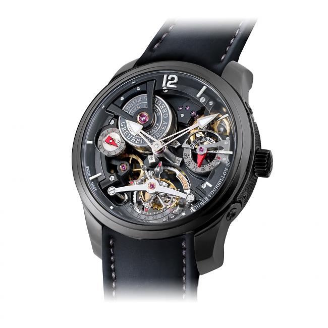 Double Tourbillon 30° ﹣30度雙體陀飛輪 Greubel Forsey的成名作品,30度雙體陀飛輪是一個單體雙軸陀飛輪,非內外兩個框架,外層是將旋轉速度拉長至四分鐘的一般陀飛輪框架,內層反而一分鐘旋轉一圈,但軸心卻傾斜了30度角,利用不同轉速和傾斜角度,將地心引力所造成的方位差盡可能降低。