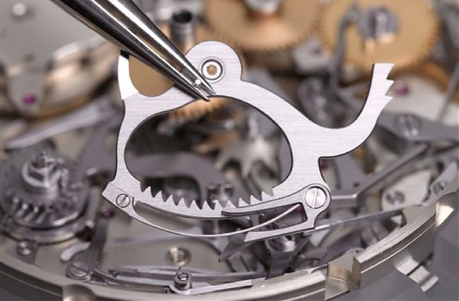鳴響裝置由獨立發條盒驅動,設有專屬輪係與槓桿式擒縱系統,確保裝置運作穩定一致。槓桿形狀複雜,經機械生產後,需由手工以銅盤和研磨膏再作調整。
