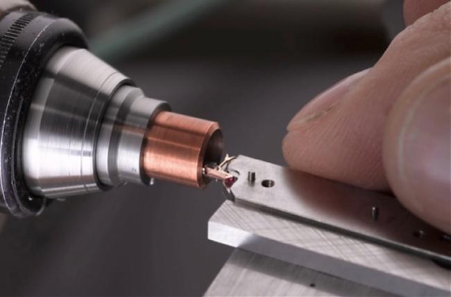 追針心軸約長17.4毫米;直徑僅0.292毫米,從面盤一直延伸至機芯下方的追針輪。心軸轉動時會對材質構成壓力,因此在組裝前必須校準特製黃銅嵌塊。
