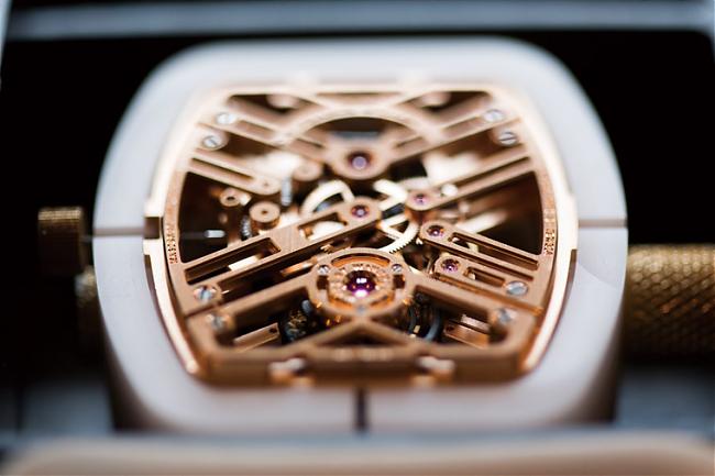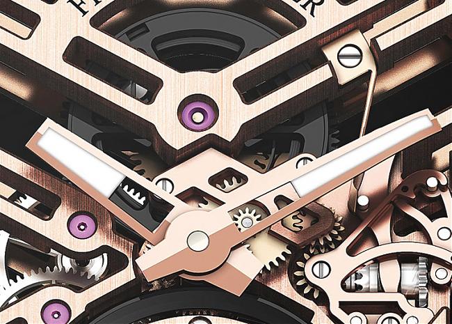 搭載過不同功能組合呈現豐富的面貌,2016年品牌則首次在Vanguard系列中採以鏤空架構,讓陀飛輪的呈現更通透迷人,同時也將品牌別具建築美感的線條完美展露。Vanguard Skeleton Tourbillon以品牌標誌性的Cintrée Curvex酒桶形錶殼登場,其帶有弧度的設計讓錶殼得以環抱手腕,營造極佳的舒適度,同時亦帶來豐富的立體感。面盤上的鏤空佈局則為其營造前衛設計感。鏤空的過程看似容易,但實際設計上卻帶有種種限制,要把機芯基板、夾板和錶橋都加以鏤空處理,製錶師除了將不必要的部分去掉,還必須顧及機芯零件重量分佈的平衡,以及計算結構的支撐強度,方能確保腕錶不會因些許碰撞便導致走時受影響,更別論Vanguard Skeleton Tourbillon配備了時刻運轉的陀飛輪裝置,錶殼與結構的強度定必再度加強。同時,鏤空結構讓機芯零件大幅外露,因此從錶面上的鏤空支架、機芯零件的外形與打磨均需經過仔細規劃,方能呈現鏤空造型的建築美感與機芯的機械動感。