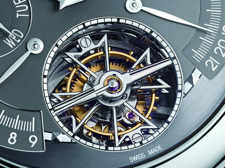 面盤6點鐘位置配備精緻的陀飛輪裝置,搭配以品牌招牌的馬爾他十字造型框架,每分鐘旋轉一周,利用反重力技術使機芯運行更為精準。